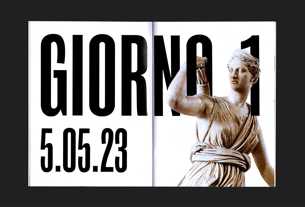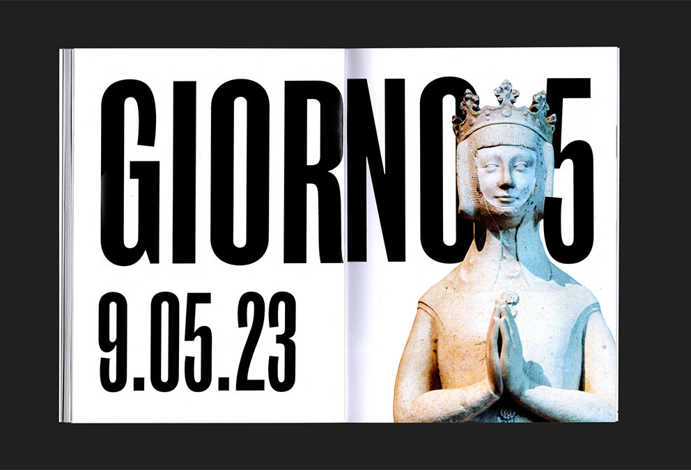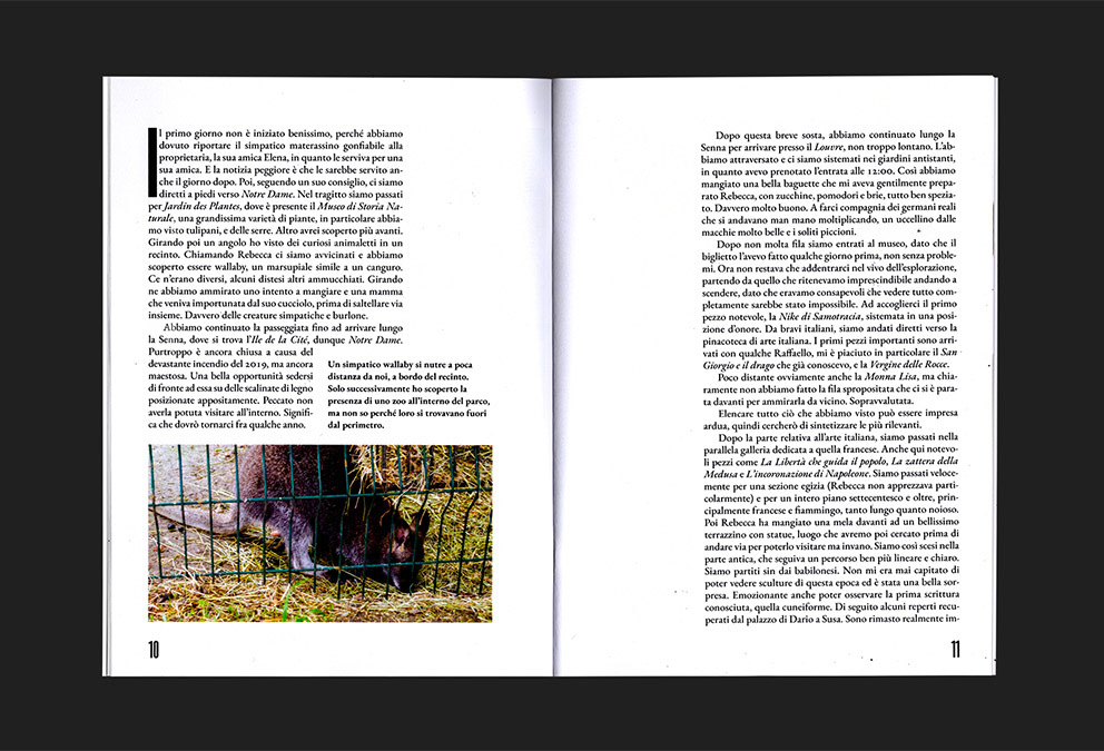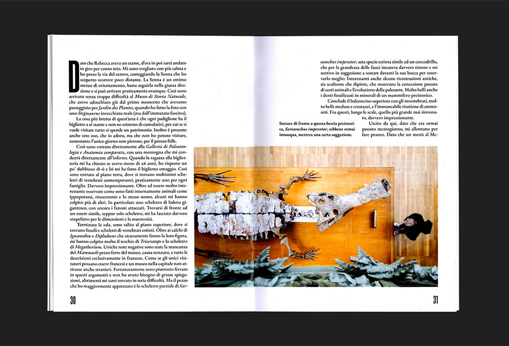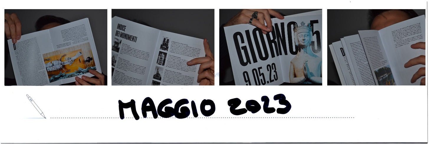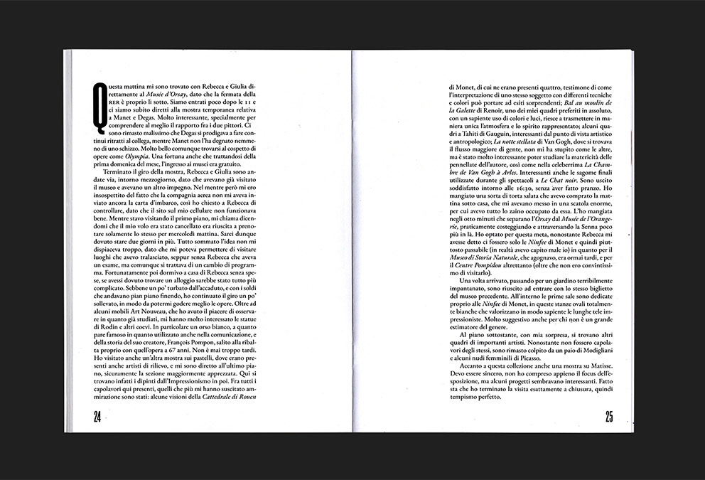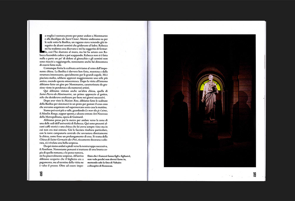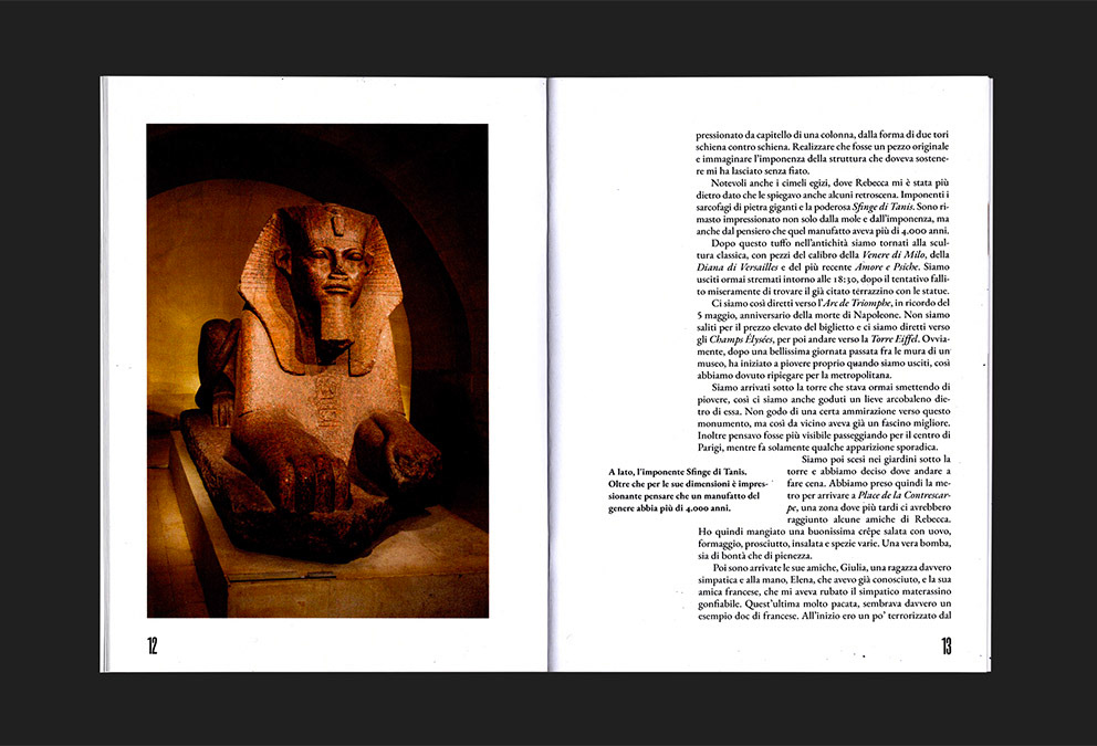 Formato 150 x 200 mm, spillato, copertina Favini Dolce Vita 270 g, interno Experia Digi Natural 100 g, 60 pagine, Font Roswell Four ITC Std, EB Garamond.
