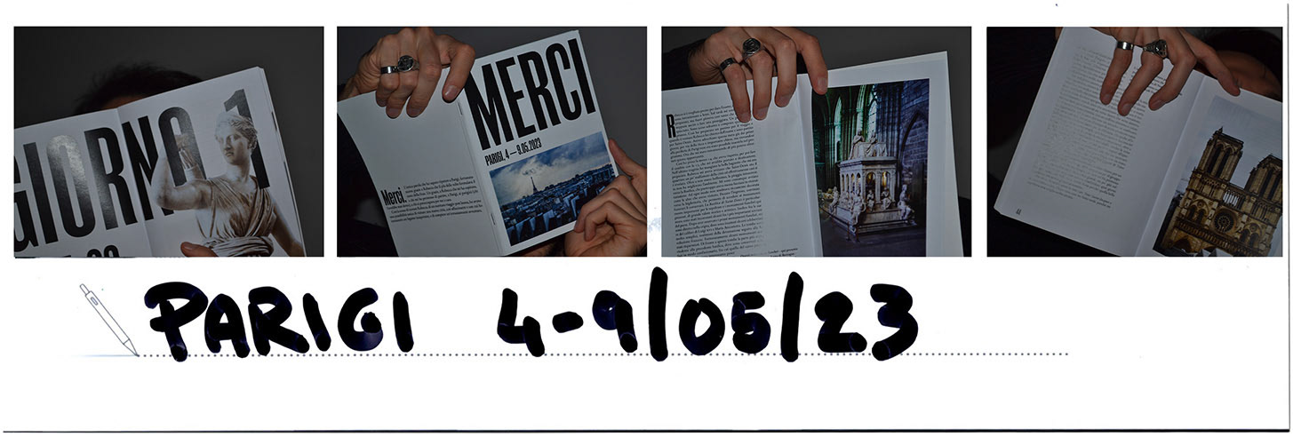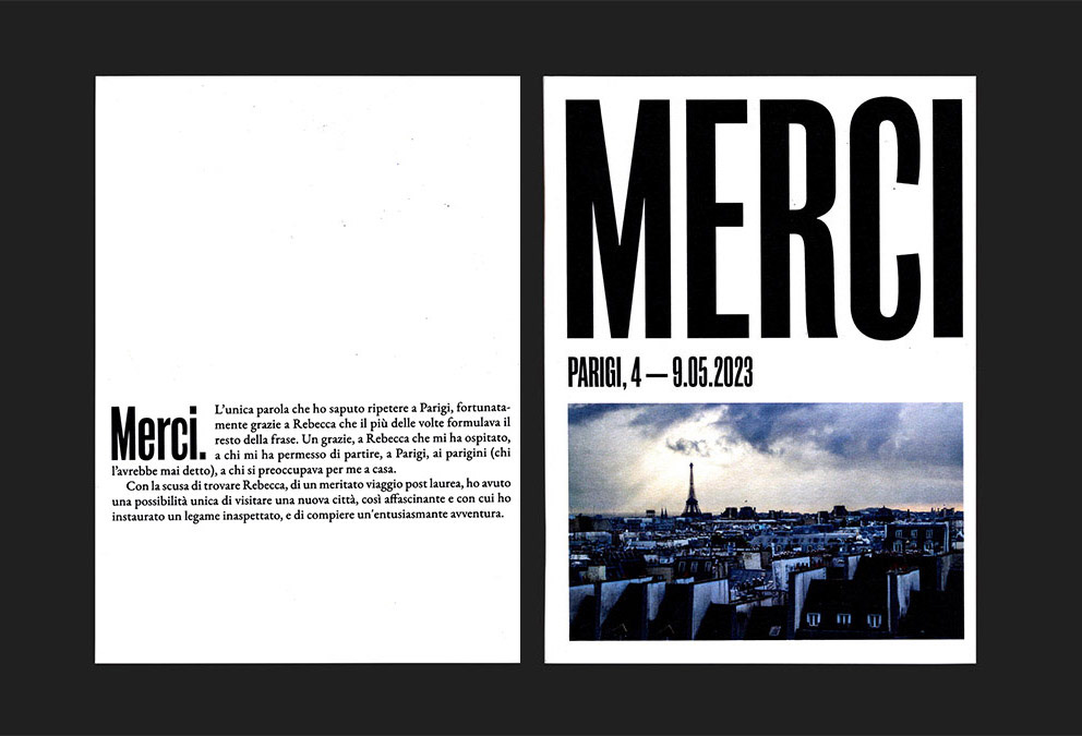 Merci è un racconto di viaggio. Non tanto una guida turistica, quanto le memorie di ciò che è accaduto durante la mia visita alla città di Parigi nel maggio 2023. Il resoconto è arricchito dalle fotografie di quei luoghi che mi hanno affascinato e che ho voluto tenere nel cuore. Ho quindi scritto e impaginato il contenuto dividendolo cronologicamente nei cinque giorni. La tipologia di carta, la rilegatura e il formato sono stati scelti per agevolare la lettura e fruibilità del progetto.