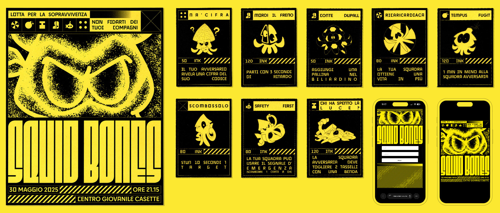 Per l'evento Squid Bones ho cercato una comunicazione che ricalcasse il tema distopico e ansiogeno del gioco. Con le illustrazioni di Alessandro Ricci ho creato le carte da gioco, i cartelli per le stanze e la locandina.