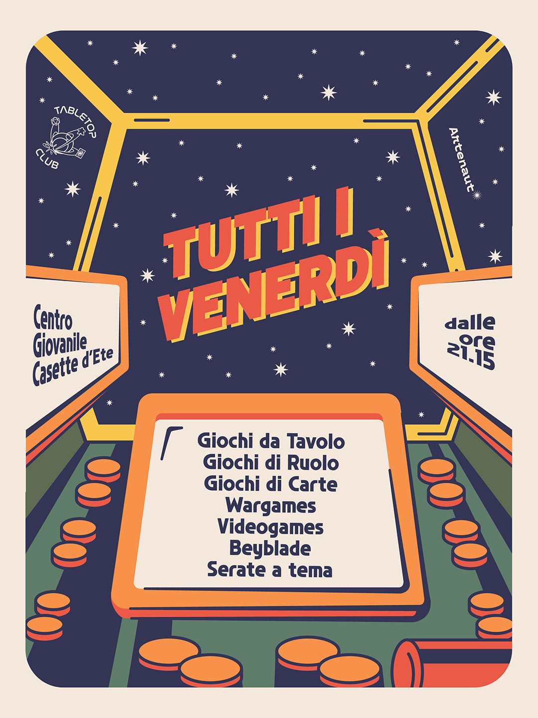 Tabletop Club è un collettivo che promuove l'incontro e la crescita tramite il gioco. Per promuovere le loro attività, ho creato un'identità basata sulle grafiche spaziali retrò. Ho poi realizzato comunicazioni social ad hoc per gli eventi specifici che si sono svolti durante l'anno.